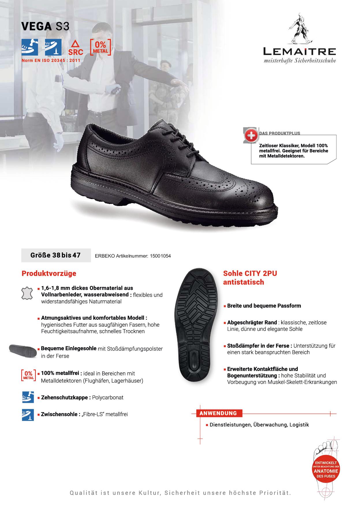 Kein Problem – hinter der eleganten Fassade aus schwarzem Voll-Leder schlummert eine große Palette an Schutzfaktoren, mit der „Mann“ nicht nur einen schlanken, sondern auch gesunden Fuß macht. Überall, wo zum Beispiel eine Uniform getragen wird und der erste Eindruck eher an Business, als an Baustelle oder Handwerk erinnern soll, ist der PEGASE die richtige Wahl. Das komplett metallfreie Modell eignet sich auch ganz speziell für Einsatzgebiete, wo diese Voraussetzung erwünscht oder unabdingbar ist.
