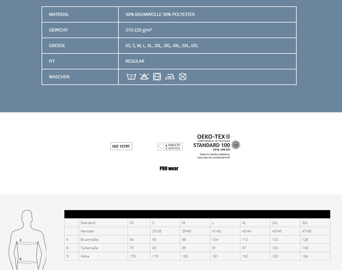 Strapazierfähiges HACCP Poloshirt mit Druckknöpfen. Nacken- und Schulterband und Nackenspiegel. Vorgekrümpft bei sehr hohen Temperaturen, sowohl vor als auch nach dem Färben, um zusätzliche Stabilität und lange Lebensdauer zu gewährleisten. Bitte beachten Sie die Übergrößenzuschläge.